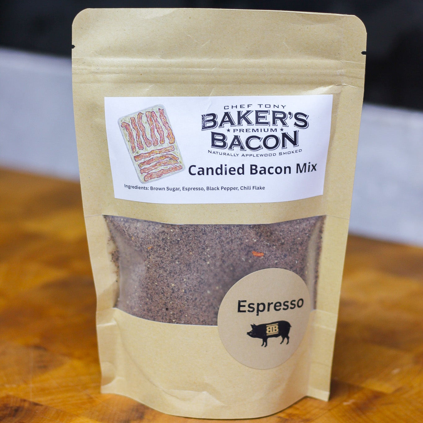 It's now available to make in your own kitchen!  Pick up a bag of one of our propriety sugar blends and add to your Baker's Bacon to create an elevated breakfast, a Bloody Mary garnish, or even just an afternoon snack.